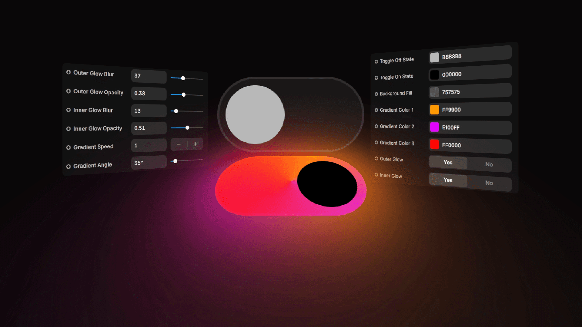 This toggle isn’t just interactive—turn it on and the background transforms with animated, moving gradients you can customize endlessly. The toggle glows, leaks luminous color past its edge, and you decide how soft, intense, or big that glow feels. Your design, your way.